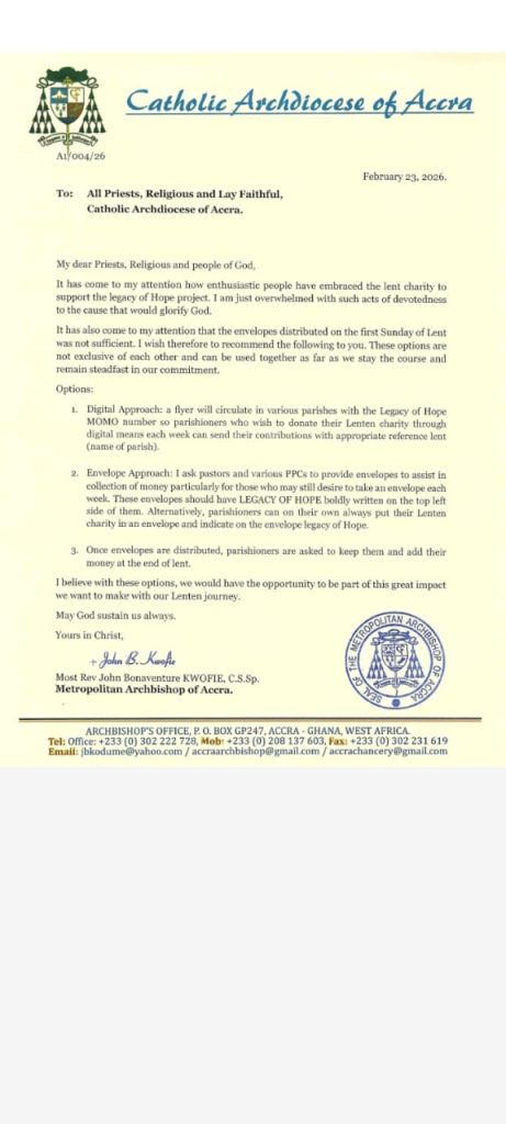 On Monday, 23 February 2026, the Metropolitan Archbishop of Accra, John Bonaventure Kwofie, issued new directives to guide the implementation of the Church’s Lenten Charity Initiative for 2026.